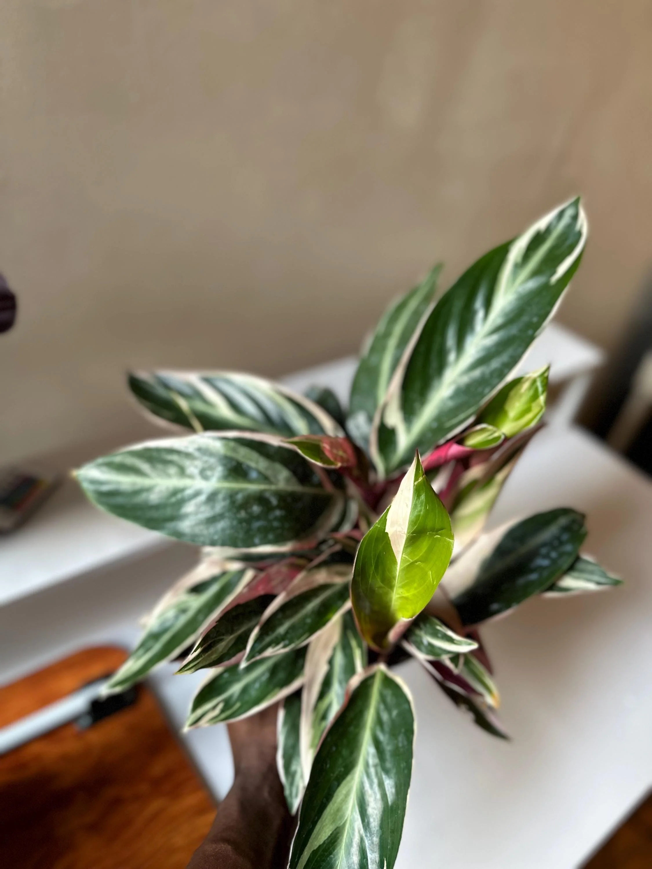 The Stromanthe Triostar is a tropical showstopper with lush leaves painted in pink, cream, and green, and deep burgundy undersides. A proud member of the prayer plant family, this plant subtly folds its leaves at night — adding natural rhythm and personality to your space.