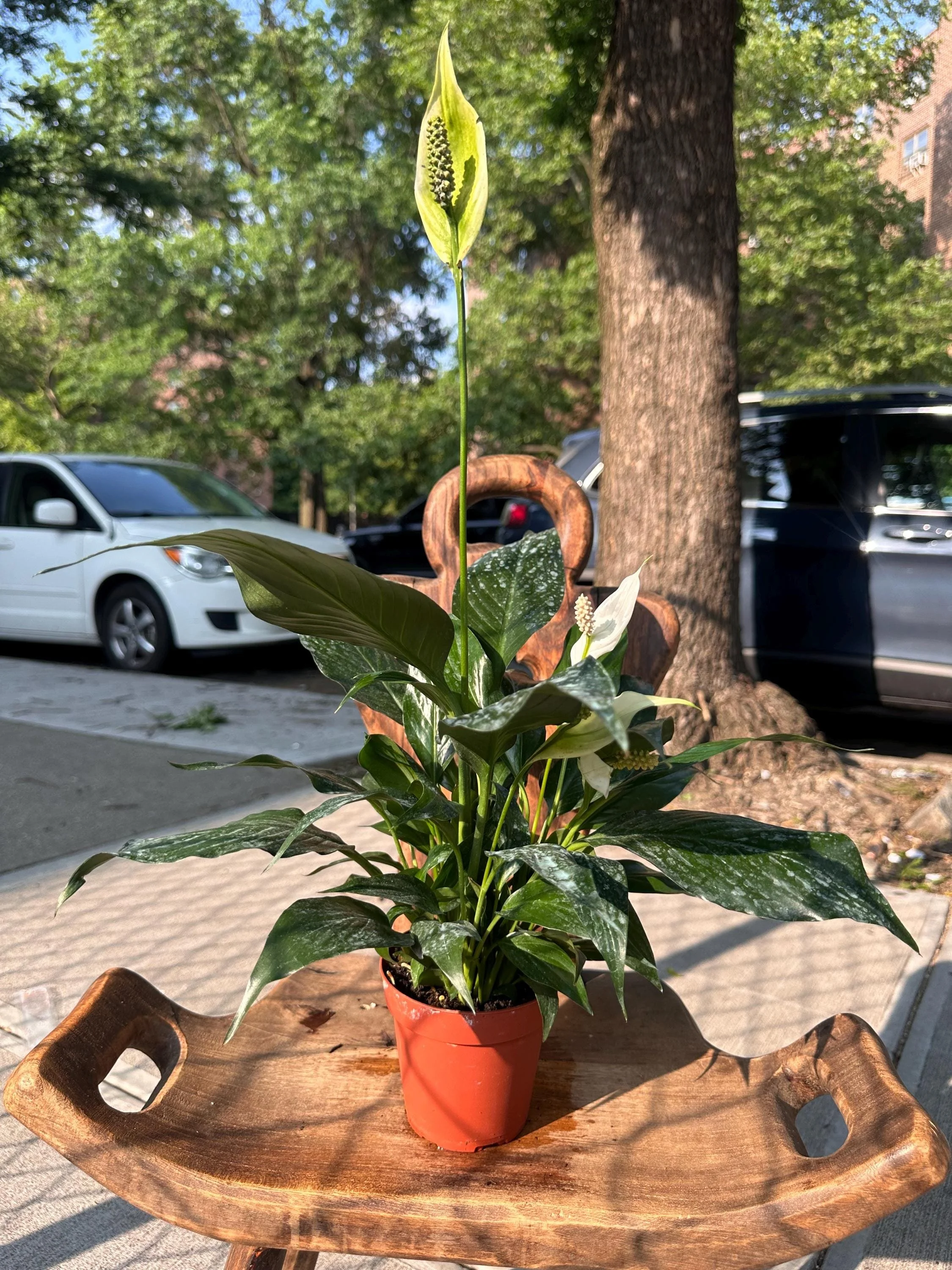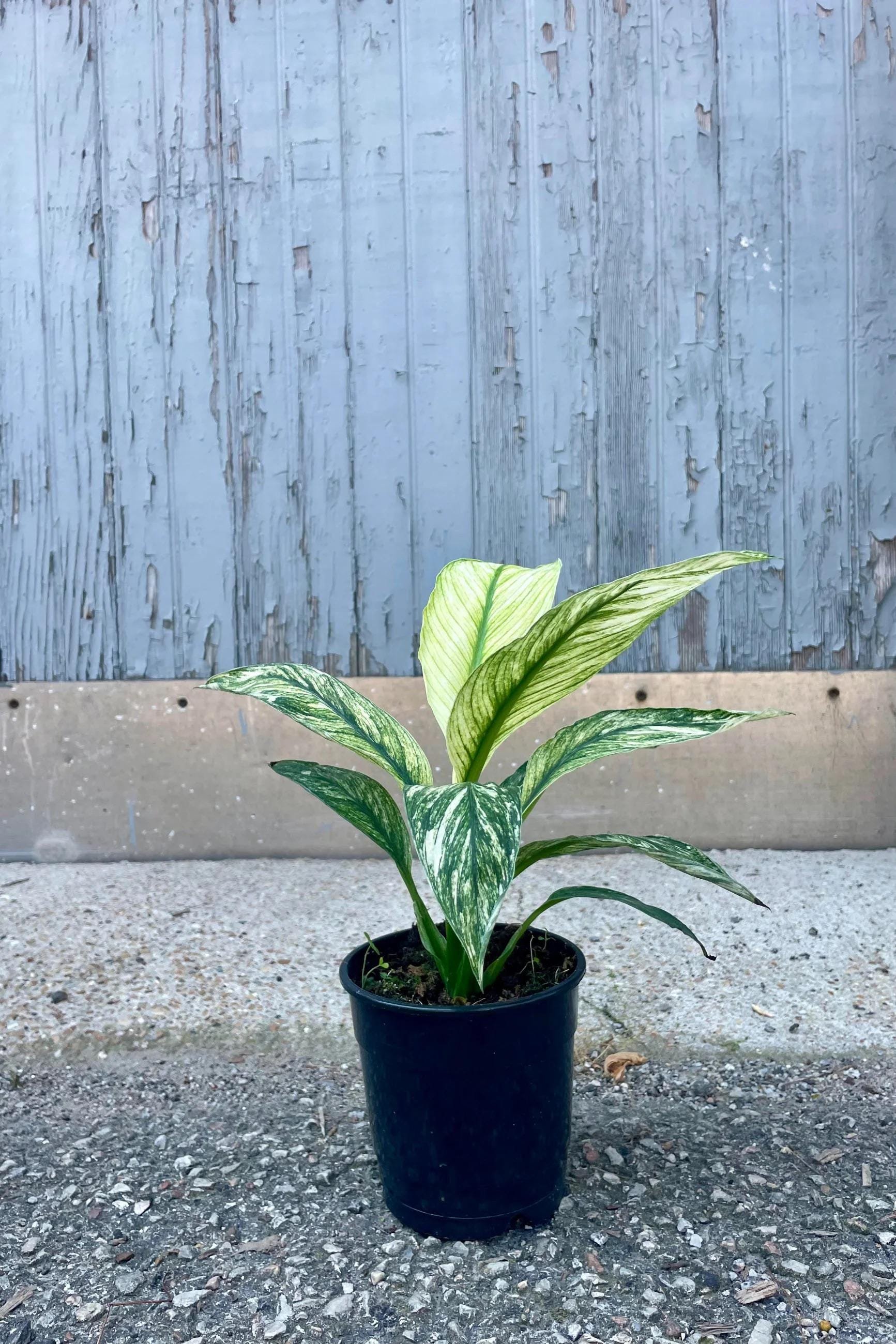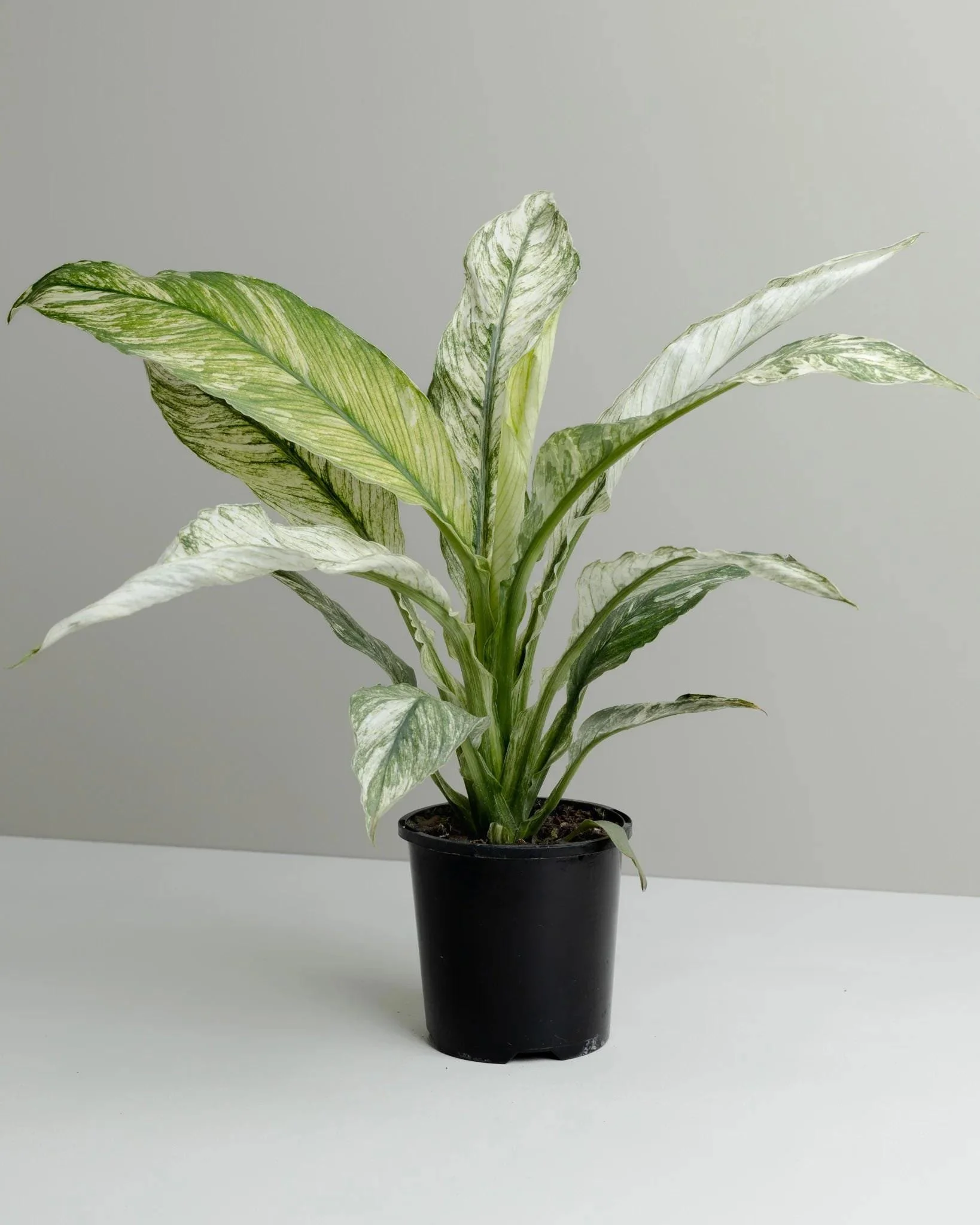 this Variegated Peace Lily ‘Sensation’ features broad, glossy leaves brushed with soft creamy-white and silver variegation that glows in bright light. It’s a compact tropical beauty that brings elegance and calm energy to any room.